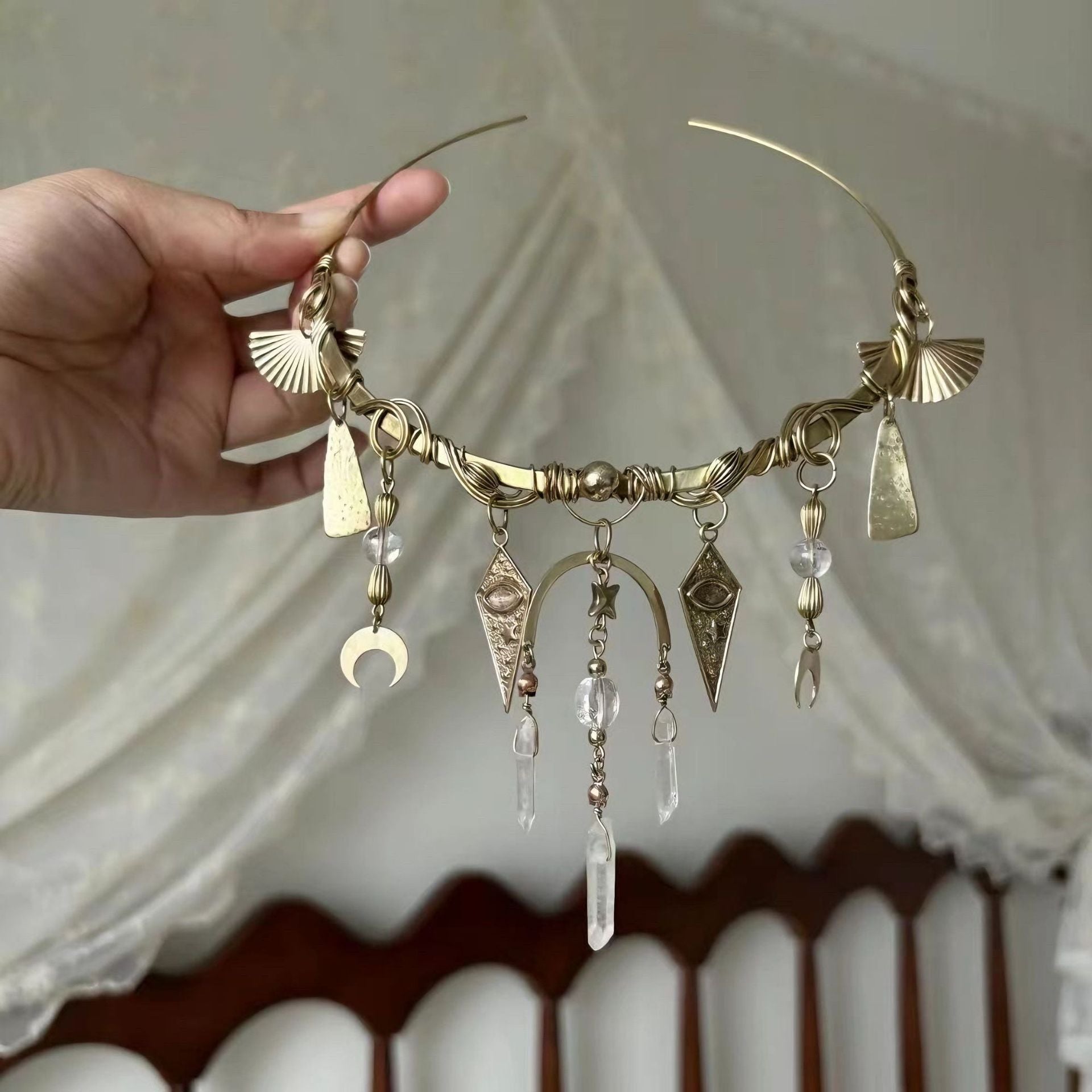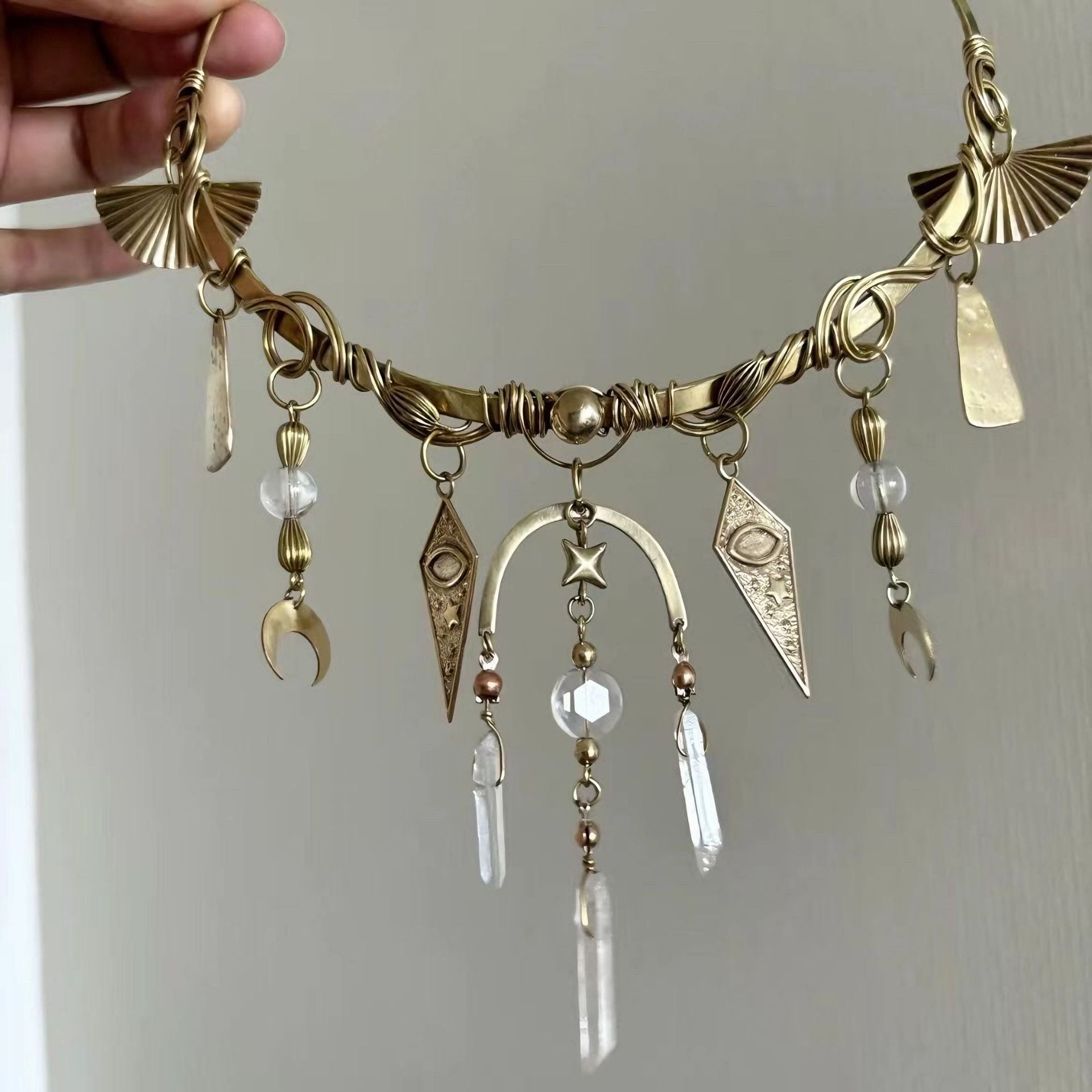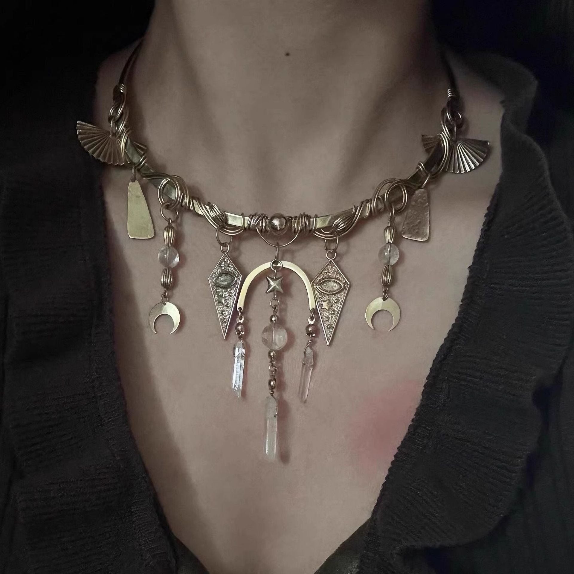 The necklace features asymmetric metal tassels and a smooth collar-style band that sits elegantly along the collarbone — a piece that catches light, mood, and attention.